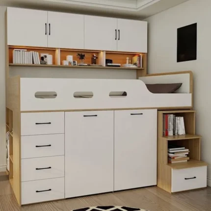 Incorpora cajoneras laterales, estantes abiertos y gabinetes superiores con puertas, ideales para almacenar libros, accesorios y objetos personales. Además, cuenta con una escalera funcional con almacenamiento adicional, brindando fácil acceso a la cama superior.