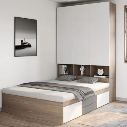 A un costado, incluye un armario espacioso con barras para colgar ropa, compartimentos cerrados y cajones adicionales que maximizan su funcionalidad. Gracias a su estructura versátil, combina descanso y organización en un solo mueble, siendo ideal para habitaciones con espacio reducido o para quienes buscan mantener un ambiente ordenado y práctico. Su diseño moderno y bien distribuido lo convierte en una solución integral para aprovechar al máximo cada rincón del dormitorio.