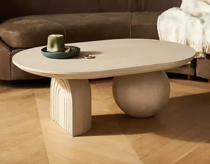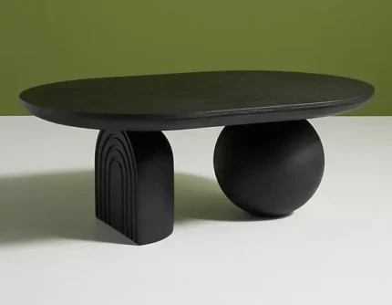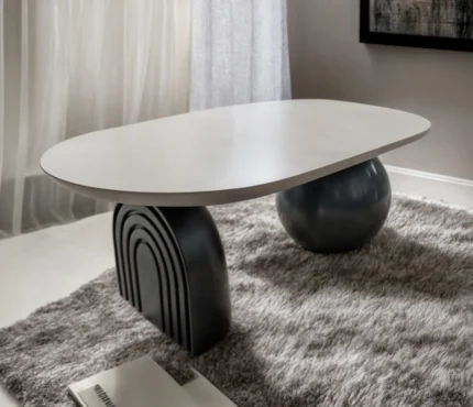 El diseño incluye patas cilíndricas robustas que aseguran estabilidad y soporte, mientras que su forma asimétrica le confiere un carácter artístico que se adapta a interiores contemporáneos o minimalistas. Esta mesa es perfecta para realzar salas de estar, oficinas o cualquier rincón donde se necesite un mueble funcional con personalidad.