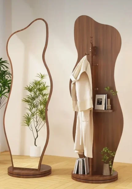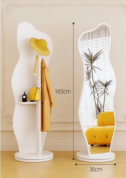 Eleva tu espacio con la combinación perfecta de diseño y practicidad. Este espejo de cuerpo completo no es solo un accesorio de decoración; es una solución de almacenamiento 2 en 1 que transformará tu dormitorio, vestidor o recibidor. Su diseño moderno con curvas suaves y marco de madera aporta un toque único y artístico a cualquier rincón. Gracias a su base giratoria de 360 grados, puedes ver tu outfit completo y, con un simple giro, acceder al práctico perchero y estante integrados. Mantén tu ropa, bolsos, sombreros y accesorios organizados y siempre a mano.