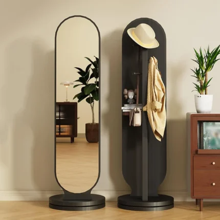 Espejo de Pie Giratorio 360° con Perchero y Estante Aura – Negro