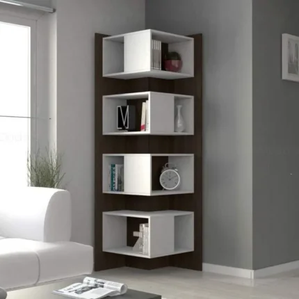 Este es un estante esquinero de diseño moderno y minimalista. Consiste en una estructura vertical de color madera oscura sobre la que se han montado cuatro módulos de almacenamiento cúbicos de color blanco. Cada cubo está abierto hacia el frente y hacia el lado que da al vértice de la esquina, creando dos espacios de almacenamiento distintos en cada nivel.