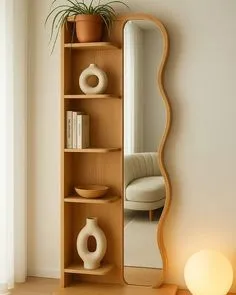 Este mueble destaca por su marco de madera natural y un diseño ondulado que añade un toque de arte y movimiento a cualquier habitación. Olvídate de los espejos tradicionales; este modelo ofrece una experiencia completa: un espejo de cuerpo entero de alta definición se une a una estantería vertical de cinco niveles, proporcionando el espacio de almacenamiento que necesitas para libros, decoraciones u otros artículos esenciales.