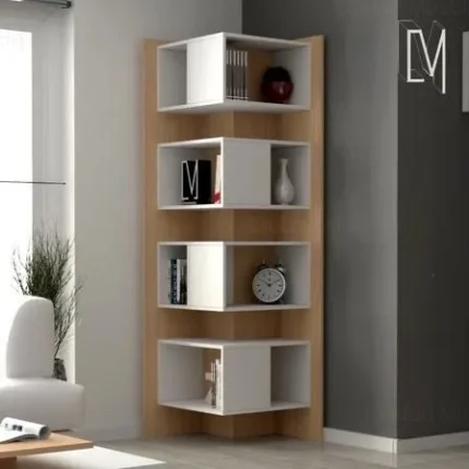 Este es un estante esquinero de diseño moderno y minimalista. Consiste en una estructura vertical de color madera clara sobre la que se han montado cuatro módulos de almacenamiento cúbicos de color blanco. Cada cubo está abierto hacia el frente y hacia el lado que da al vértice de la esquina, creando dos espacios de almacenamiento distintos en cada nivel.