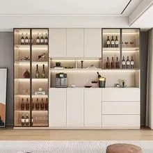 Esta vitrina moderna combina elegancia y funcionalidad con un diseño estilizado. Cuenta con puertas de vidrio enmarcadas en tonos oscuros, estantes iluminados con luces LED y espacios diseñados para almacenar botellas, copas y accesorios. Su distribución equilibrada permite exhibir y organizar bebidas de manera sofisticada, mientras que los cajones inferiores brindan almacenamiento adicional. Su estilo minimalista y contemporáneo la hace ideal para distintos ambientes.