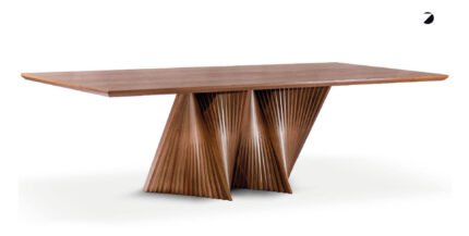 Esta mesa es una pieza de mobiliario impresionante que destaca por su diseño escultórico y contemporáneo. Su base está compuesta por una serie de listones de madera dispuestos en un patrón geométrico dinámico, creando una sensación de movimiento y profundidad. La estructura se ensancha y se estrecha en puntos estratégicos, brindando un equilibrio perfecto entre estabilidad y estética. El tablero rectangular, de acabado liso y cálido, complementa la base artística, proporcionando un contraste armonioso entre sofisticación y funcionalidad. Esta mesa es ideal para espacios modernos y elegantes, convirtiéndose en el centro de atención en comedores o salas de reuniones con estilo vanguardista.
