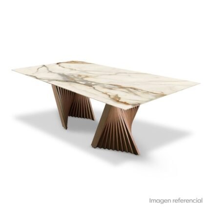 Descubre la sofisticación moderna con esta impresionante mesa de comedor. Su elegante tablero rectangular, con una lujosa superficie de imitación mármol en tonos suaves y vetas doradas, se apoya sobre una base escultural única. Dos soportes dinámicos, compuestos por láminas metálicas dispuestas en un fascinante diseño de espiral o abanico con acabado en bronce, aportan un toque artístico y contemporáneo a cualquier comedor. Esta pieza central no solo ofrece un espacio elegante para tus comidas, sino que también se convierte en una declaración de estilo refinado.