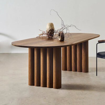 Lo más llamativo de la mesa es su base, compuesta por estructuras de madera con cortes curvos y vacíos geométricos, lo que le da un carácter escultórico y un toque contemporáneo. Esta combinación de formas curvas y materiales sólidos crea un balance perfecto entre robustez y diseño innovador.