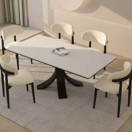 El tablero de la mesa está elaborado en piedra sinterizada, un material de alta tecnología que destaca por su resistencia al calor, manchas y rayones. Su acabado imita el mármol con delicadas vetas naturales, aportando lujo y sofisticación al conjunto. Los bordes del tablero están pulidos cuidadosamente, no solo para realzar su estética, sino también para proporcionar mayor seguridad y evitar bordes afilados.
