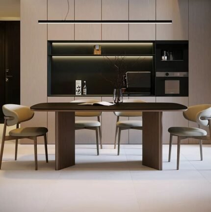 Este conjunto de comedor combina elegancia y funcionalidad, ideal para ambientes modernos y sofisticados. La mesa está construida con madera sólida de tornillo, conocida por su durabilidad, resistencia y un acabado natural que realza su diseño. Su base presenta un diseño en panel doble con líneas rectas, ofreciendo gran estabilidad y un toque contemporáneo que se adapta a diferentes estilos de decoración. El tablero de la mesa está elaborado en piedra sinterizada, un material de alta tecnología que destaca por su resistencia al calor, manchas y rayones. Su acabado imita el mármol con delicadas vetas naturales, aportando lujo y sofisticación al conjunto. Los bordes del tablero están pulidos cuidadosamente, no solo para realzar su estética, sino también para proporcionar mayor seguridad y evitar bordes afilados. Las sillas complementan perfectamente el diseño, con estructuras de madera de tornillo reforzadas con tornillos de acero inoxidable. Sus asientos y respaldos están acolchados con espuma de alta densidad, recubiertos en cuero sintético de tonos claros que ofrecen comodidad y estilo. Medidas de la mesa: