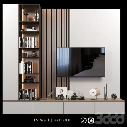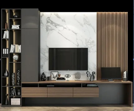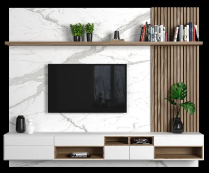 Un módulo vertical con estantes ofrece espacio decorativo. La base neutra se extiende, proporcionando espacio para dispositivos y almacenamiento oculto. La iluminación tenue resalta los detalles. Ideal para salones modernos que buscan diseño y funcionalidad.
