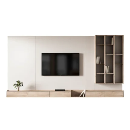 El panel trasero en acabado liso y claro proporciona un fondo sutil y sofisticado para el televisor, mientras que la base flotante en tono madera clara agrega calidez y funcionalidad con sus cajones de almacenamiento integrados.