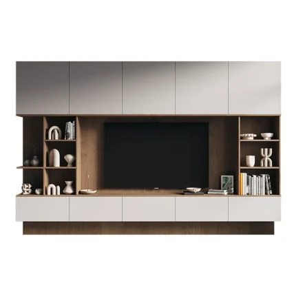 Este centro de entretenimiento presenta un diseño moderno y funcional que combina almacenamiento cerrado y estantes abiertos para una distribución equilibrada. Los tonos neutros y oscuros crean un contraste elegante, permitiendo que se integre fácilmente en diferentes estilos de decoración. Su estructura simétrica enmarca la pantalla de manera armoniosa, mientras que los estantes laterales ofrecen espacio para exhibir libros, adornos y objetos decorativos, aportando personalidad al ambiente.