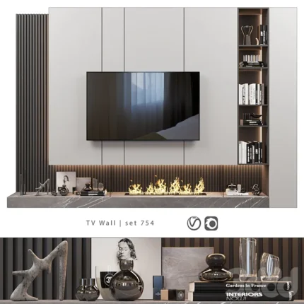 Un módulo vertical con estantes ofrece espacio decorativo. La base con imitación de mármol se extiende, proporcionando espacio para dispositivos y una chimenea eléctrica integrada. La iluminación tenue resalta los detalles. Ideal para salones modernos que buscan diseño y funcionalidad.