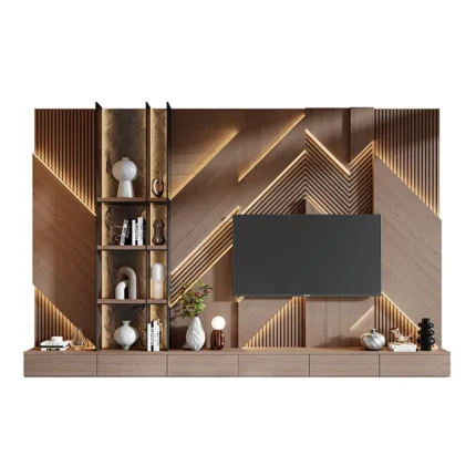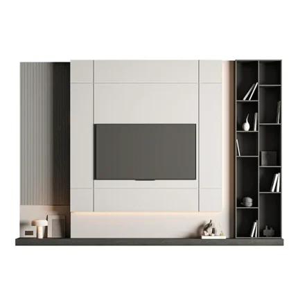Este centro de entretenimiento combina funcionalidad y diseño moderno, ideal para maximizar el almacenamiento y aportar un estilo elegante al espacio. Su estructura integra compartimentos cerrados en la parte superior e inferior, proporcionando una solución práctica para organizar diversos objetos. La zona central está enmarcada por un panel con listones decorativos que aportan profundidad y textura, creando un fondo atractivo para el televisor. A un costado, repisas abiertas permiten exhibir libros y elementos decorativos, añadiendo un toque sofisticado. Su diseño minimalista y detalles bien pensados lo convierten en una pieza versátil para cualquier ambiente.