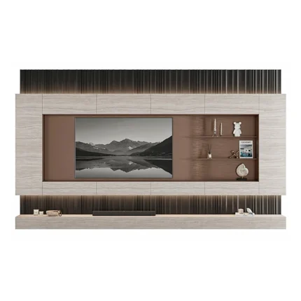 Este centro de entretenimiento combina elegancia y funcionalidad con un diseño moderno y sofisticado. El área principal destaca por su integración de paneles en tonos claros y detalles en madera, creando un equilibrio visual armonioso. La base en tono oscuro con textura marmoleada añade un toque de lujo y contraste.