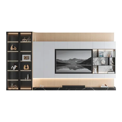 A la izquierda, una vitrina con estantes iluminados resalta los objetos decorativos y aporta profundidad al diseño. En la parte superior, gabinetes cerrados ofrecen almacenamiento adicional manteniendo la estética ordenada y limpia. Este diseño es ideal para quienes buscan un mueble versátil que combine almacenamiento, decoración y tecnología en un solo espacio.