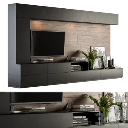 Este centro de entretenimiento destaca por su diseño contemporáneo y minimalista, con una combinación elegante de tonos oscuros y claros.