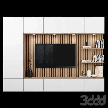 Este centro de TV moderno combina funcionalidad y estética en un diseño equilibrado. El panel blanco mate enmarca el televisor, creando un punto focal definido. Un panel listonado añade textura y modernidad.