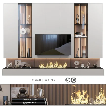 La base neutra se extiende, proporcionando espacio para dispositivos y almacenamiento oculto. Una chimenea eléctrica integrada añade calidez. La combinación de elementos crea un diseño equilibrado. Ideal para salones modernos que buscan funcionalidad y estética.