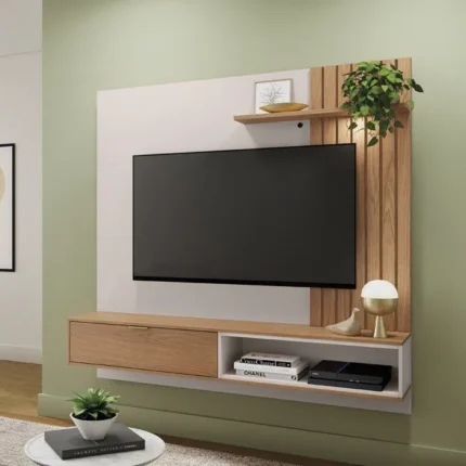 Estantes flotantes ofrecen espacio decorativo. La base combina madera y blanco, proporcionando espacio para dispositivos y almacenamiento oculto. La iluminación tenue resalta los detalles. Ideal para salones modernos que buscan diseño y funcionalidad.