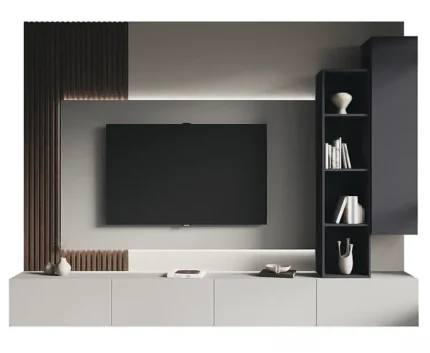 El módulo lateral combina almacenamiento cerrado y estanterías abiertas, ofreciendo tanto funcionalidad como espacio para exhibir objetos decorativos. La base flotante se extiende a lo largo de la pared, proporcionando una superficie despejada para dispositivos multimedia y elementos decorativos.