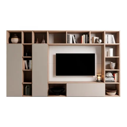 Este centro de entretenimiento destaca por su diseño funcional y elegante, ideal para organizar y decorar cualquier sala de estar. Su estructura incorpora múltiples compartimentos abiertos y cerrados, ofreciendo una solución versátil para almacenamiento y exhibición. La combinación de tonos claros y neutros aporta luminosidad y modernidad al espacio, mientras que el marco alrededor del televisor crea un efecto visual sofisticado. Sus líneas limpias y distribución equilibrada lo convierten en una pieza práctica y estilizada, perfecta para complementar interiores contemporáneos con un toque de calidez y orden.