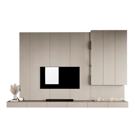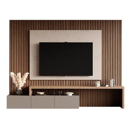 Este centro de TV minimalista destaca por su diseño elegante y funcional. El panel de pared en tonos neutros, con líneas verticales sutiles, crea un fondo sofisticado y limpio. El televisor se integra perfectamente en este panel, siendo el foco central.