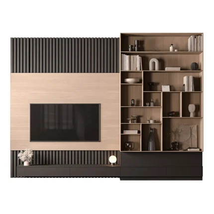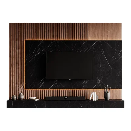 Este centro de entretenimiento destaca por su diseño elegante y contemporáneo, fusionando materiales de alto contraste para un efecto sofisticado. El panel trasero combina listones de madera en tono cálido con una gran losa en acabado negro marmoleado, creando una estética moderna y lujosa.