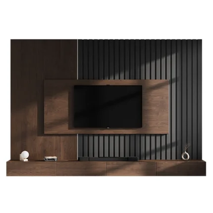 Este centro de TV moderno fusiona texturas y funcionalidad. El panel central claro enmarca el televisor, creando un foco definido. Paneles listonados oscuros a los lados añaden textura y modernidad.