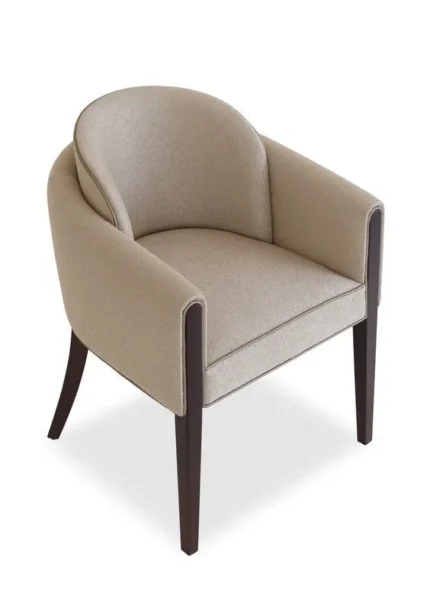 El asiento es amplio y acolchonado, proporcionando una sensación de suavidad y descanso. Los detalles en los bordes, con un fino ribete en contraste, resaltan su diseño moderno y refinado. Además, sus patas robustas y ligeramente inclinadas aportan estabilidad y un toque.