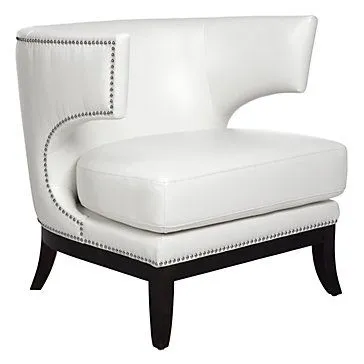 El tapizado en un tono marfil o blanco crema le otorga una apariencia sofisticada y versátil, fácil de combinar con distintos estilos de decoración. La tela o cuero sintético utilizado es de alta calidad, con costuras bien definidas que resaltan su forma. Además, los bordes están decorados con tachuelas metálicas, agregando un detalle refinado al diseño.