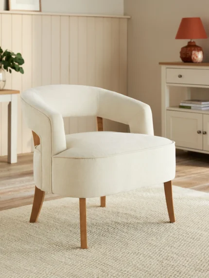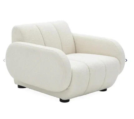 El tapizado en tela tipo bouclé de color claro ofrece una textura suave y cálida, además de ser un material resistente y de fácil mantenimiento. Su diseño curvo y orgánico envuelve al usuario, brindando una sensación de confort envolvente. Las patas cónicas de madera natural complementan la estética del sillón, aportando un acabado sofisticado y elegante.