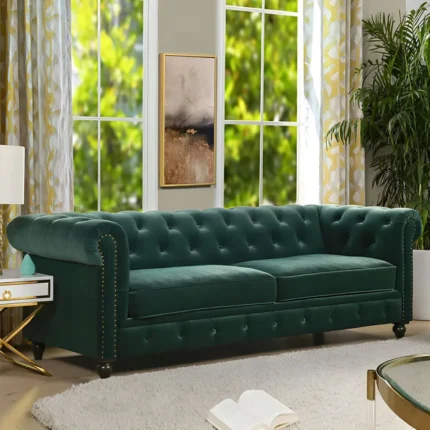 Este producto es un sofá de estilo clásico y contemporáneo. Este sofá combina un diseño clásico inspirado en los sofás Chesterfield. Los detalles capitoné y el terciopelo evocan lujo y tradición. Es ideal para interiores que buscan un equilibrio entre elegancia clásica y toques contemporáneos. Funciona bien en ambientes clásicos, modernos, glamurosos o minimalistas, dependiendo de cómo se combine con otros elementos. Con patas de madera con un estilo clásico con una forma circular, incluye deslizadores en la parte inferior, para evitar rayaduras en el piso.