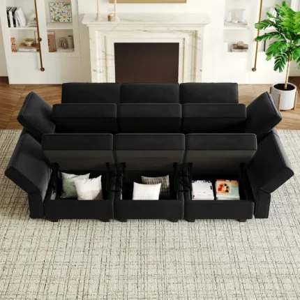 El diseño incluye varios puff móviles, que pueden utilizarse de manera independiente o integrarse al sofá para modificar su forma y funcionalidad. Además, cada puff cuenta con un compartimento tipo baúl, ideal para almacenar mantas, cojines u otros objetos, maximizando el aprovechamiento del espacio.