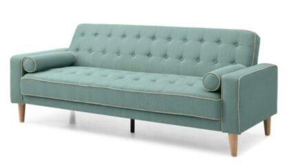 El diseño incorpora detalles como costuras decorativas y botones en el respaldo, que le dan un toque contemporáneo y atractivo. Sus brazos están equipados con cojines cilíndricos que añaden comodidad adicional y un diseño distintivo. Las patas de madera maciza le aportan una estética limpia y moderna, además de proporcionar firmeza.