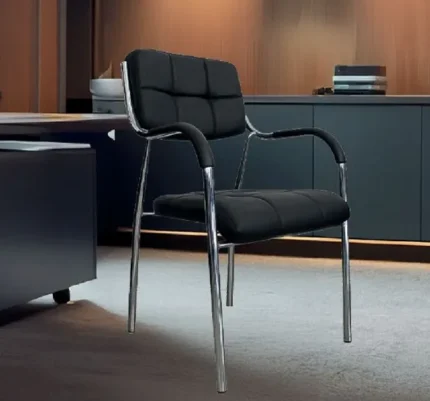 Esta silla tiene un diseño moderno y funcional, ideal para oficinas, salas de espera o espacios de conferencias. Su asiento y respaldo acolchados están tapizados en material negro, con detalles en relieve en el respaldo que mejoran la ventilación y el confort. La estructura metálica cromada con base tipo trineo proporciona estabilidad y un aspecto elegante. Su diseño ergonómico y ligero permite un uso cómodo y versátil en diversos entornossuave al tacto.