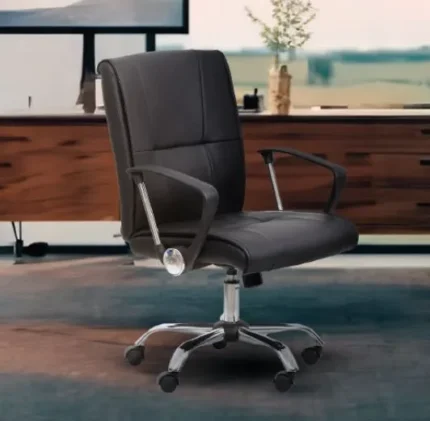 Esta silla ejecutiva ofrece comodidad y estilo para oficinas y espacios de trabajo. Su asiento y respaldo acolchados están tapizados en material negro, con un diseño de costuras discretas que aportan elegancia. Cuenta con reposabrazos curvos de material resistente para mayor soporte. La base metálica cromada de cinco ruedas proporciona estabilidad y movilidad. Además, incluye un mecanismo de ajuste de altura y reclinación para mayor ergonomía. Su diseño moderno y funcional la hace ideal para largas jornadas laborales.