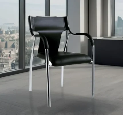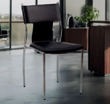 Esta silla tiene un diseño ligero y moderno, ideal para oficinas, salas de espera o comedores. Su asiento y respaldo están tapizados en material negro con un acabado elegante y detalles en costuras. La estructura metálica cromada con cuatro patas delgadas le da estabilidad y resistencia. El respaldo cuenta con una sección abierta que mejora la ventilación y brinda un toque distintivo. Su diseño minimalista y funcional la hace versátil para diversos entornos.