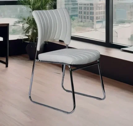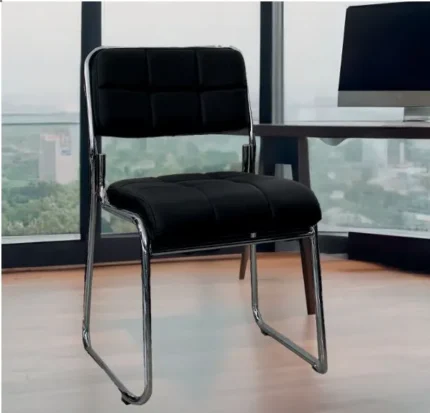 Esta silla tiene un diseño sencillo y moderno, ideal para oficinas, salas de espera o espacios de trabajo. Su asiento y respaldo acolchados están tapizados en material negro, proporcionando comodidad y soporte. La estructura metálica cromada con base tipo trineo le da estabilidad y un aspecto elegante con sus curvas finas en la estructura.