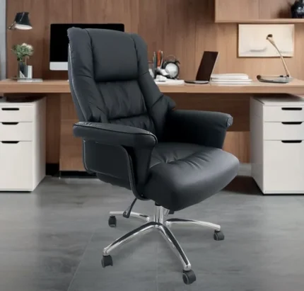 Esta silla ejecutiva combina elegancia y confort, ideal para oficinas y despachos. Su diseño ergonómico incluye un respaldo alto con acolchado extra y detalles en costuras horizontales que brindan soporte lumbar. El asiento es amplio y cómodo, tapizado en material negro de alta calidad. Los reposabrazos acolchados y con estructura metálica cromada añaden un toque sofisticado. Cuenta con una base giratoria de cinco ruedas, ajuste de altura y mecanismo de inclinación, ofreciendo una experiencia de uso cómoda y funcional.
