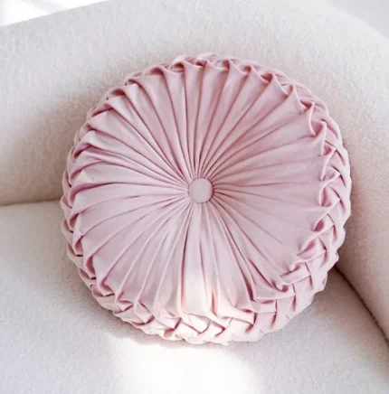 Este producto es un cojín decorativo redondo con un diseño elegante y detallado, ideal para añadir un toque cómodo a cualquier espacio. Su confección destaca por un patrón plisado que converge de manera armoniosa en el centro, donde un botón forrado del mismo material aporta un detalle visual refinado. Este diseño único combina funcionalidad y estilo, siendo perfecto para complementar sofás, sillones o camas, ya sea en ambientes clásicos o contemporáneos.