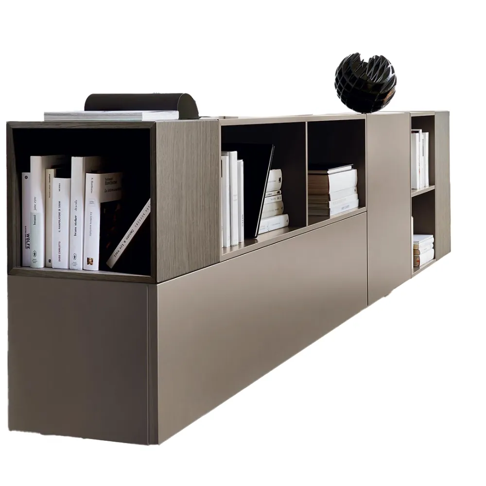Este aparador de diseño flotante combina elegancia y funcionalidad.tonos neutros y oscuros.