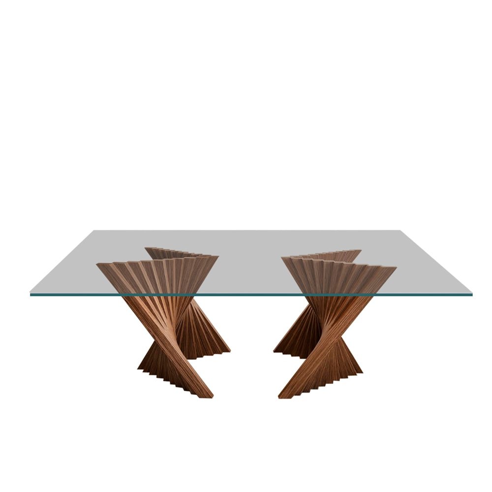 Esta mesa de comedor con superficie de vidrio destaca por su diseño elegante y contemporáneo, ideal para realzar cualquier espacio. Su base escultórica combina funcionalidad y arte, brindando estabilidad mientras añade un elemento visual único.