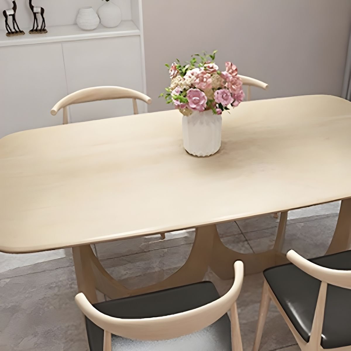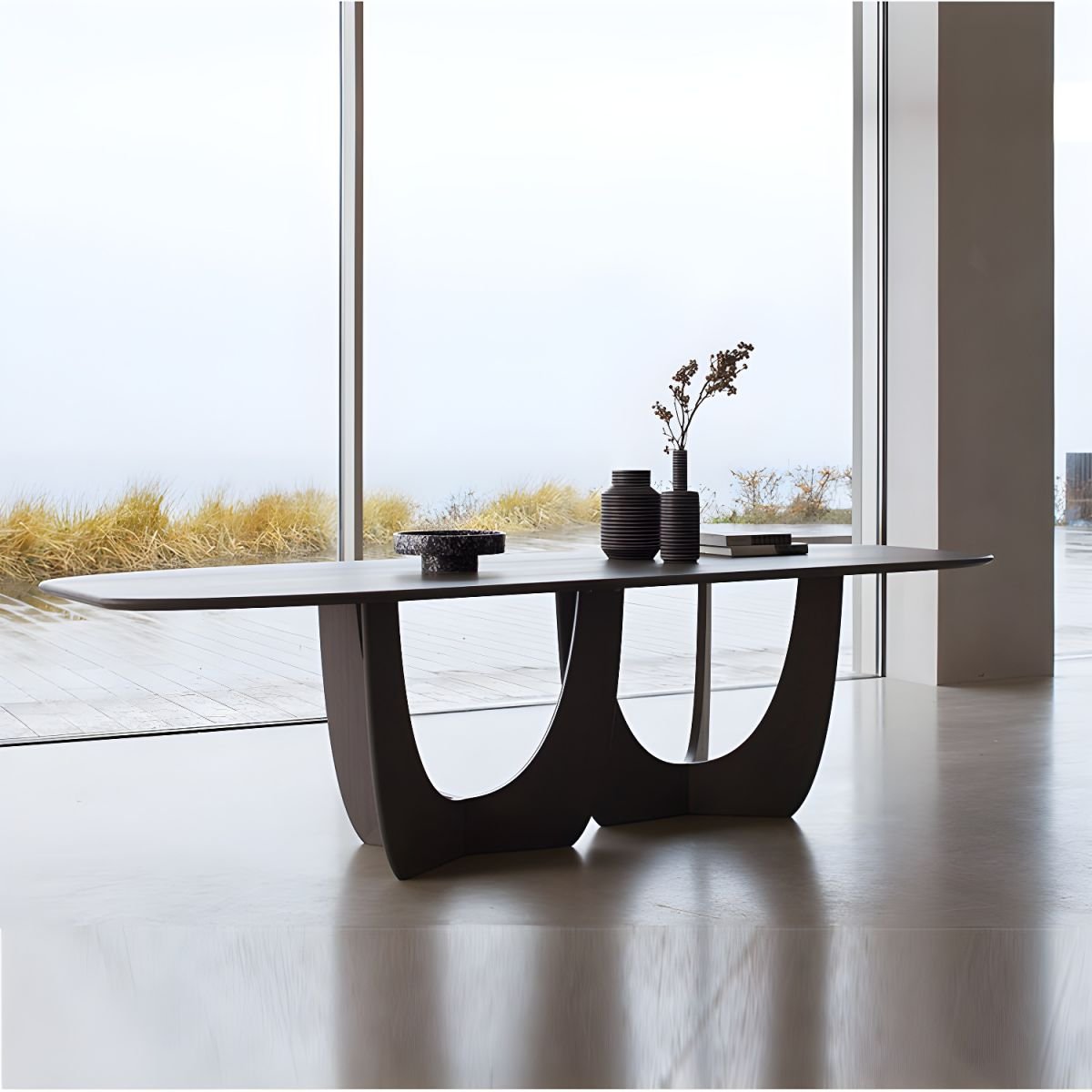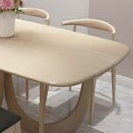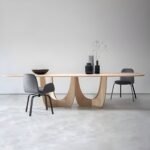 Esta mesa de diseño vanguardista combina elegancia y originalidad en una pieza sofisticada. Su tablero largo y delgado presenta bordes suavemente curvados, aportando un aire moderno y refinado. La base, compuesta por dos estructuras esculpidas con formas orgánicas y recortes simétricos, crea un efecto visual ligero y dinámico, manteniendo al mismo tiempo una estructura sólida y estable. Fabricada en madera clara, esta mesa se adapta fácilmente a espacios contemporáneos, aportando calidez y distinción. Su diseño único la convierte en una pieza central ideal para comedores o salas de reuniones con un estilo minimalista y artístico.