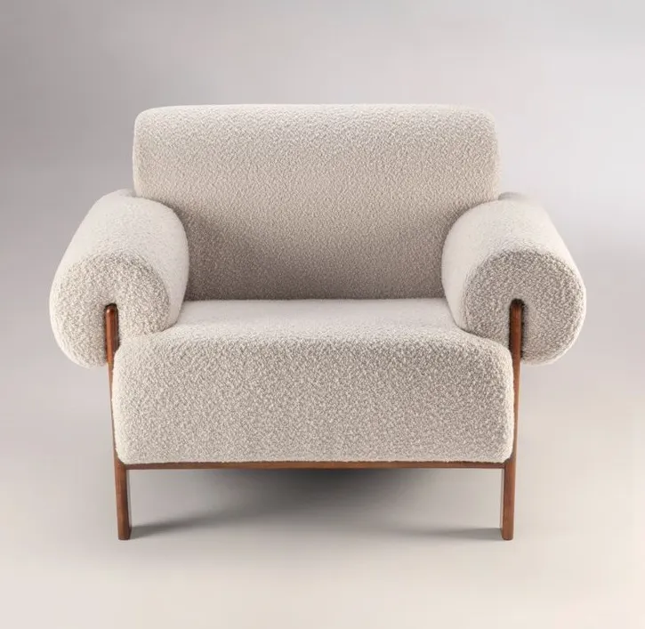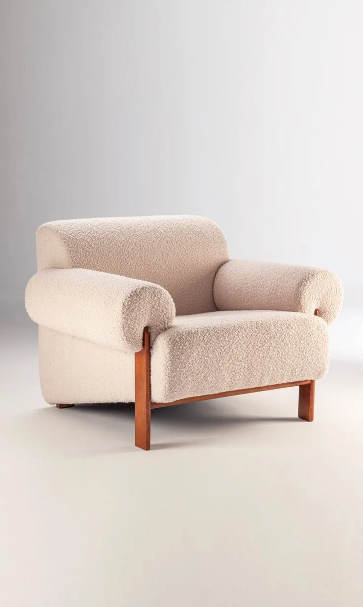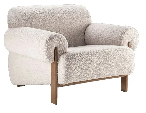 El tapizado en tela tipo bouclé de color claro ofrece una textura suave y cálida, además de ser un material resistente y de fácil mantenimiento. Su diseño curvo y orgánico envuelve al usuario, brindando una sensación de confort envolvente. Las patas cónicas de madera natural complementan la estética del sillón, aportando un acabado sofisticado y elegante.