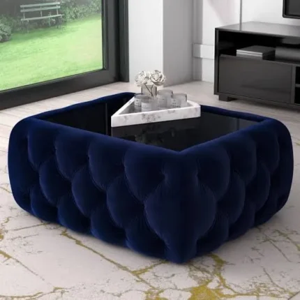 El acolchonado está compuesto por espuma de alta densidad, proporcionando una superficie suave al tacto y un confort adicional en caso de uso como asiento auxiliar. La parte superior cuenta con un tablero de vidrio templado de alta resistencia, ideal para colocar objetos decorativos, libros o bandejas sin comprometer la estética ni la funcionalidad.