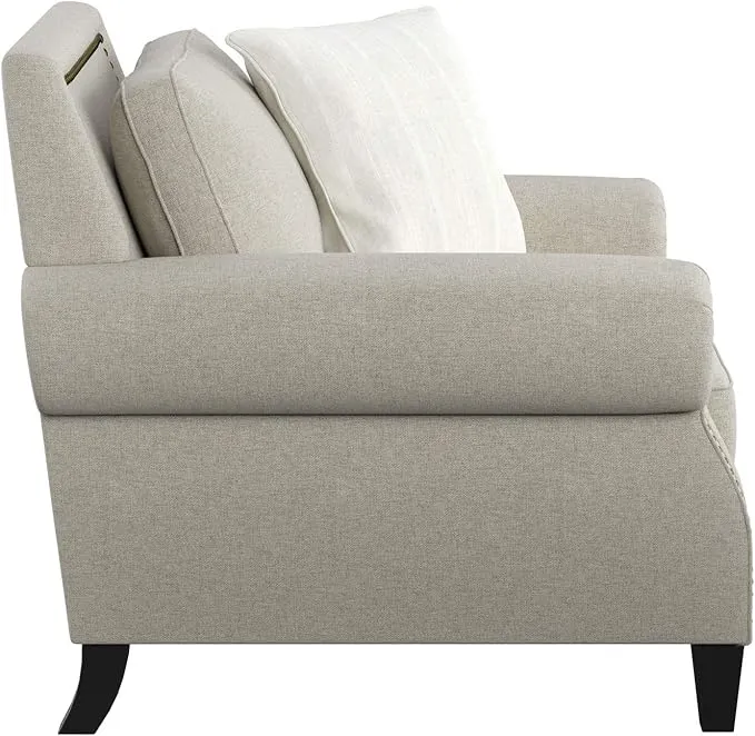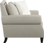 El asiento y el respaldo están acolchados con espuma de alta densidad , ofreciendo un confort excepcional y una excelente recuperación de forma. Su tapizado en tela color crema, junto con las aplicaciones de tachas decorativas en los bordes, le dan un toque clásico y refinado.