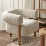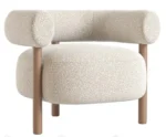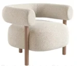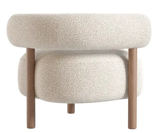 El tapizado en tela tipo bouclé de color claro ofrece una textura suave y cálida, además de ser un material resistente y de fácil mantenimiento. Su diseño curvo y orgánico envuelve al usuario, brindando una sensación de confort envolvente. Las patas cónicas de madera natural complementan la estética del sillón, aportando un acabado sofisticado y elegante.