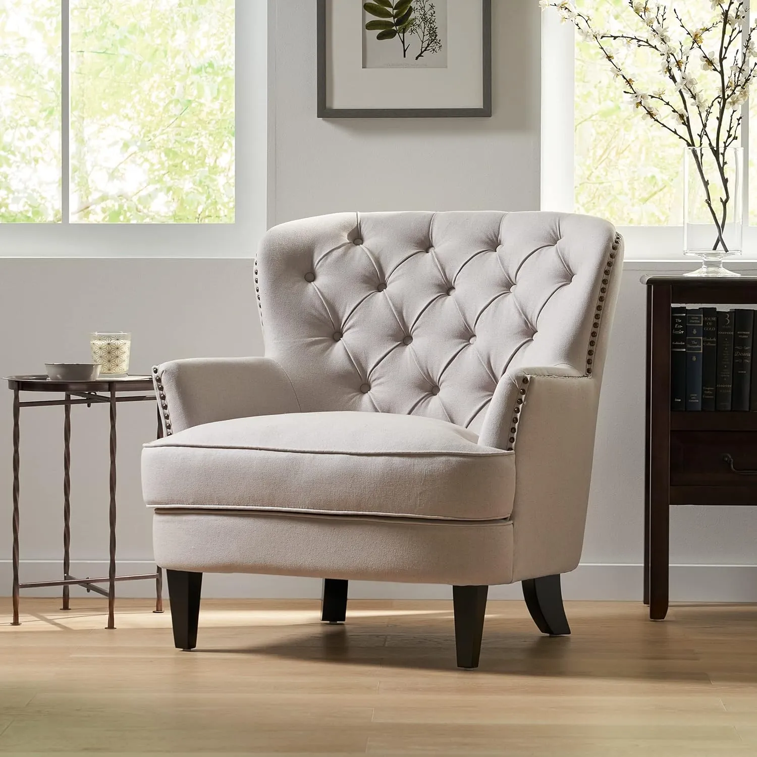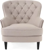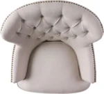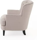 Este elegante sillón combina un diseño clásico con una estructura resistente y materiales de alta calidad. Su respaldo alto y ligeramente curvado está tapizado en tela de tono claro con un sofisticado capitoné de botones, lo que le da un toque de distinción y elegancia. Además, cuenta con aplicaciones de tachas metálicas en los bordes, aportando un detalle decorativo refinado.